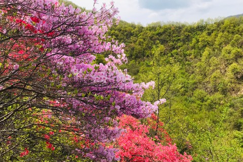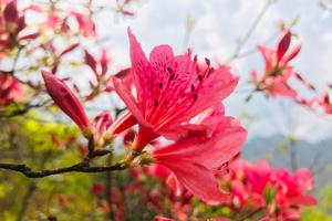 鸡冠山海拔1602米,是河南省汝阳县海拔最高的山。这里山清水秀,空气清新,周边山岭起伏,很适宜喜阳的杜鹃生长。鸡冠山杜鹃品种多样,按开花花期早晚大致可分早、中、晚三种。花期早的主要有淡紫色、朱红色等,当地人将这两种色泽的杜鹃花分别称之谓贵人紫、大红袍吧!踏上位于鸡冠山的王坪乡孟村杜鹃岭,有“花中西施”美誉的杜鹃花衬托在中晚期开放的“花骨朵”之中,吐露芬芳,招蜂引蝶,煞是好看。还不到盛花期,就已经吸引了不少游客的眼球,赏花踏春,早睹为快,目前基本进入盛花期。