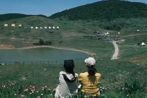 蓝天、白云、绿草与花海交织,人在其中,云在脚下,恍若天上人间。