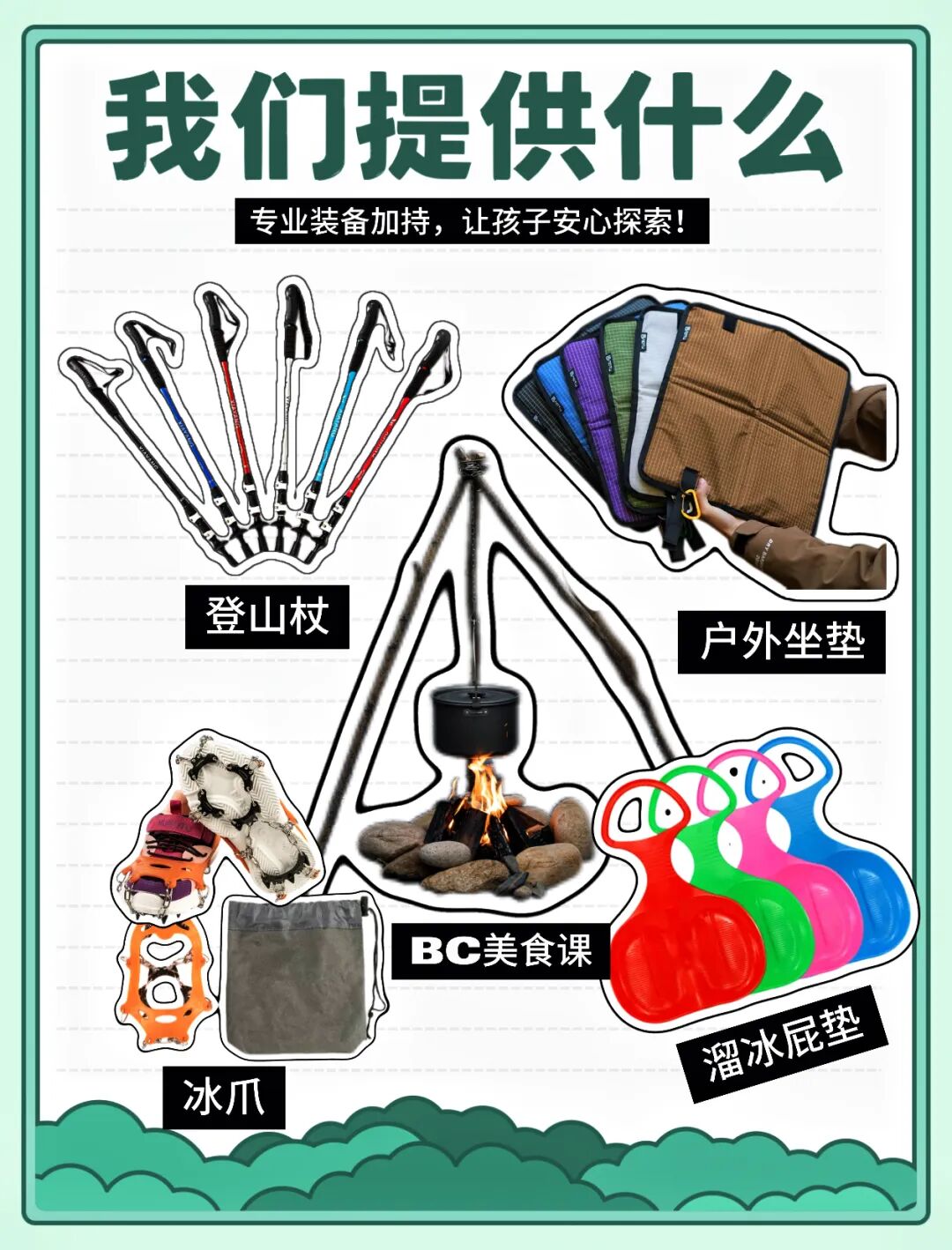 “系统性技能提升:实用技能,终身受用”+“多类型地形徒步:低难度高体验感” + “多主题趣味探索:玩出生命力” +“5大核心能力:看得见的成长收获”