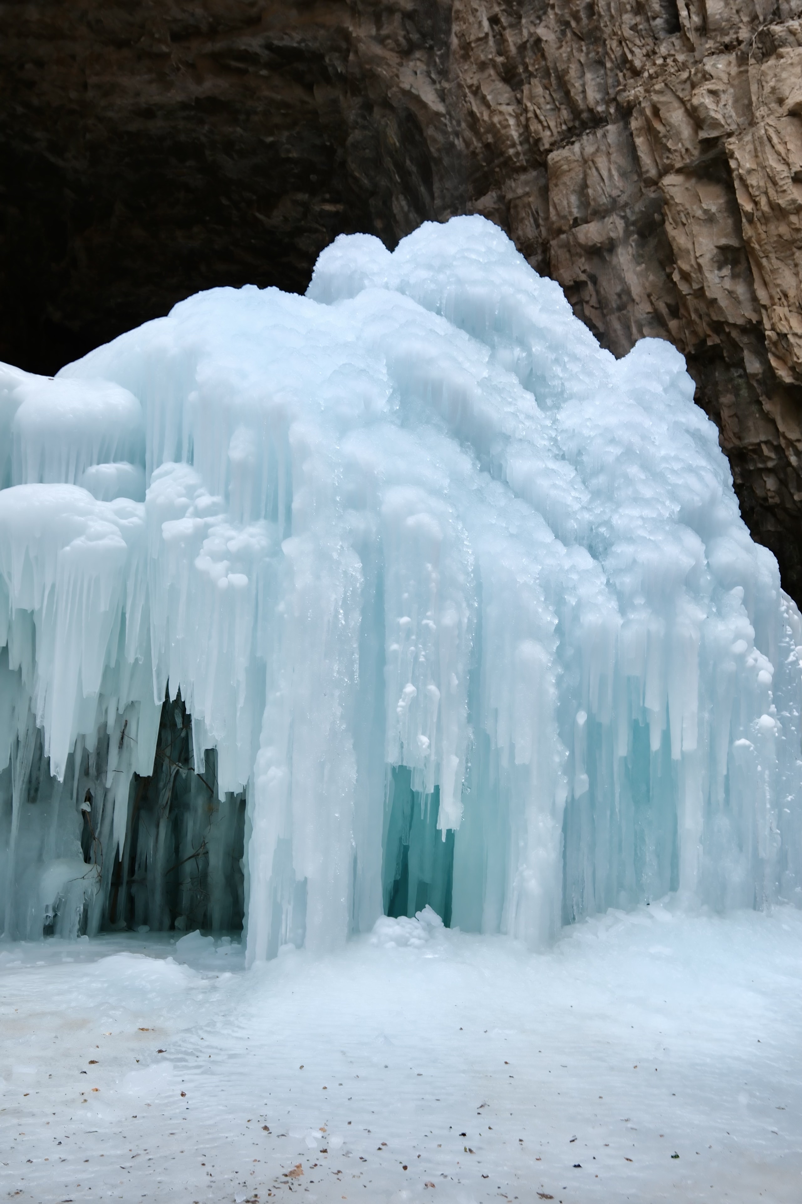 百米高的冰瀑从峭壁之巅倾泻而下,晶莹剔透的冰柱在阳光下闪烁着梦幻的光芒。远远望去,仿佛一道银色的瀑布在瞬间被时光定格。